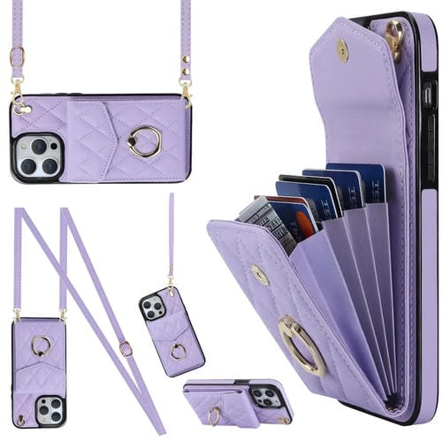 Funda para Teléfono iPhone 13 Pro Max Rhombic Texture Card Bag con Cordón Largo (Púrpura Claro)