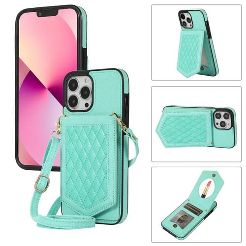 Funda para iPhone 13 Pro Max Rhombic Texture Rfid con Cordón y Espejo (Verde Menta)