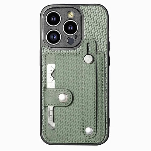 Funda para iPhone 13 Pro Max Wristband Kickstand Card Wallet Back Cover con Tool Knife (Verde)
