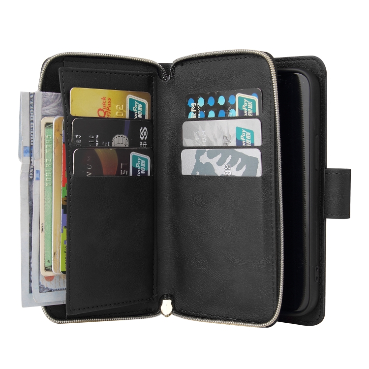 Funda para iPhone 14 Monedero de Cuero con Cremallera y 9 Ranuras para Tarjetas (Negro)