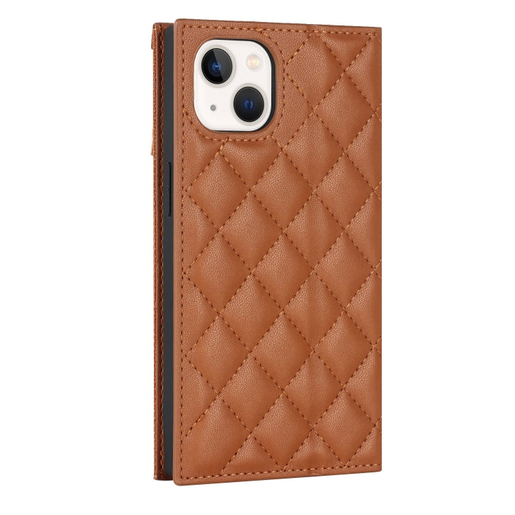 Funda de Cuero con Cremallera para iPhone 14 Grid Texture Lanyard (Marrón)