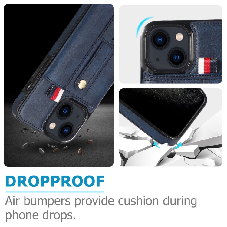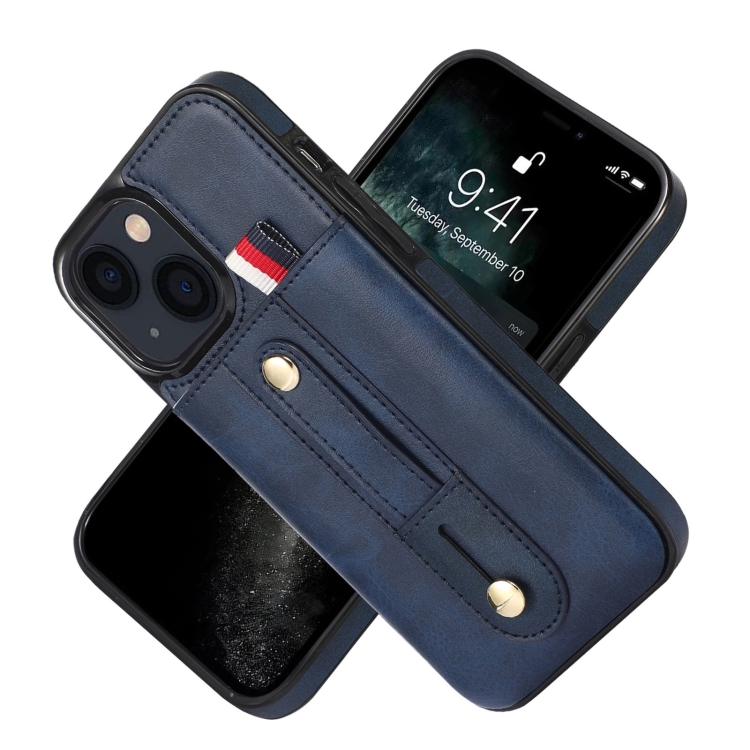 Funda para Teléfono iPhone 14 Muñequera Kickstand Wallet de Cuero (Azul)