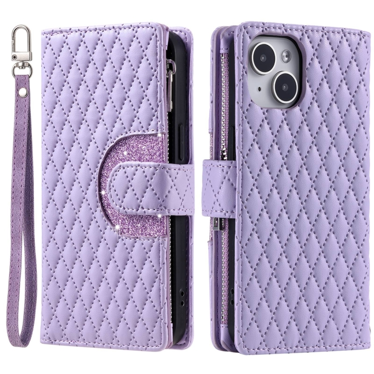 Estuche de Cuero para iPhone 14 Plus con Billetera, Cremallera y Celosía con Purpurina (Púrpura)