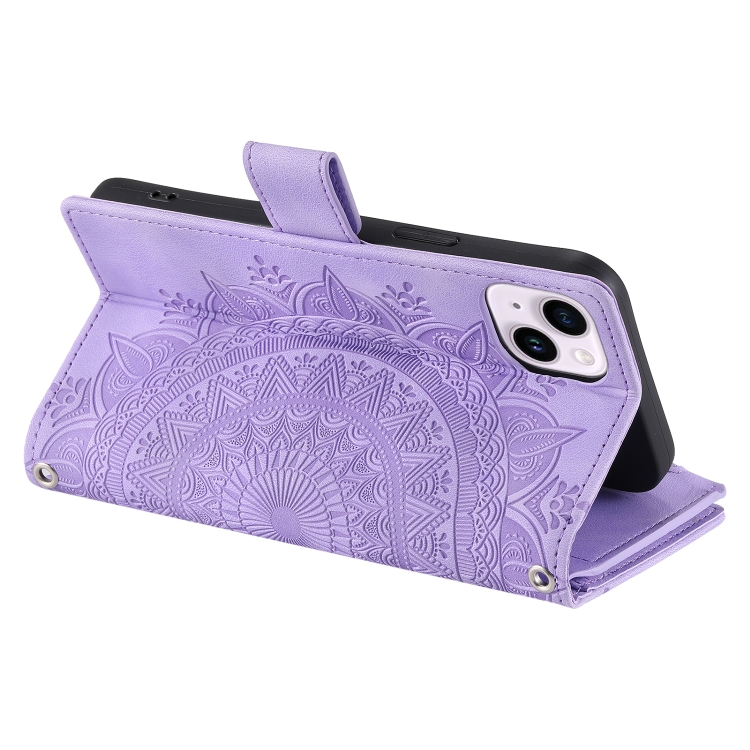 Funda de Cuero para iPhone 14 Plus con Cremallera Totem y Múltiples Tarjetas (Púrpura)