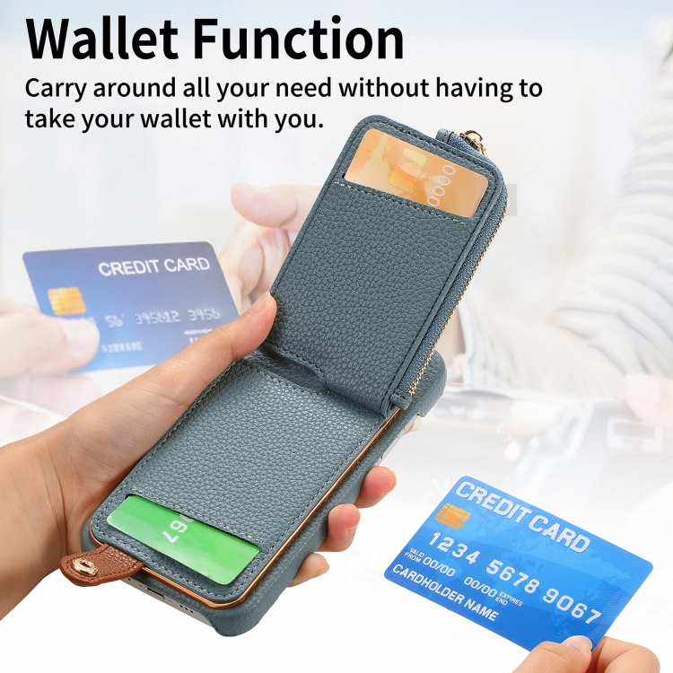 Funda Trasera para iPhone 14 Plus con Billetera Cremallera y Anillo Cuero Litchi (Azul Claro)