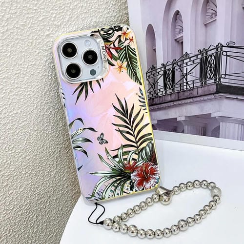 Estuche para Teléfono iPhone 14 Pro con Flor Láser Galvanizada y Correa para Muñeca (Hojas Ah12)