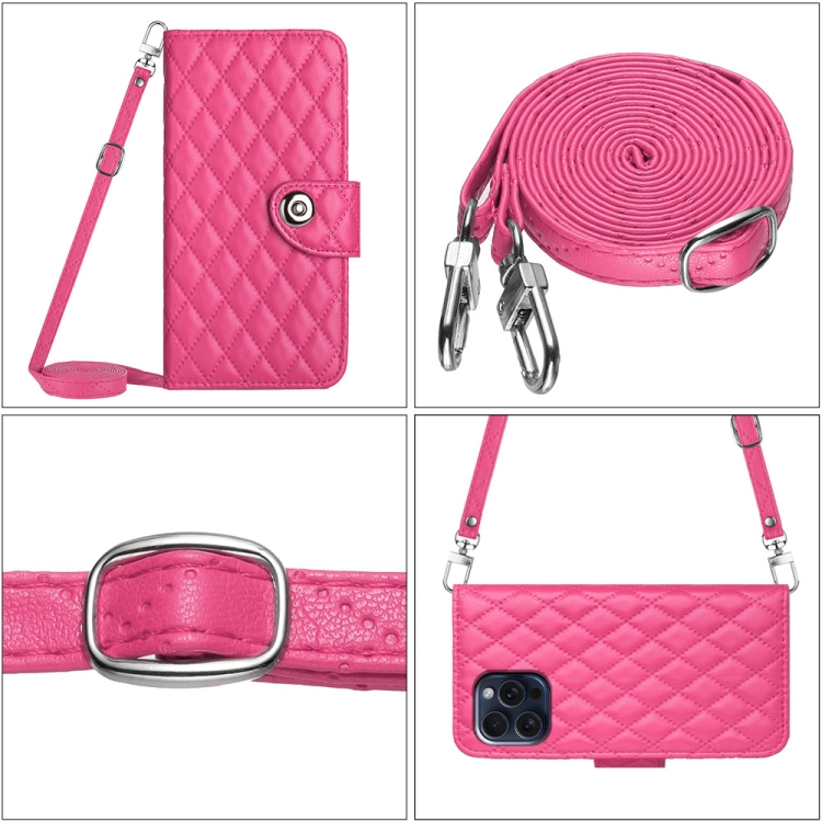 Funda para Teléfono iPhone 14 Pro Max con Tapa de Cuero Textura Rómbica y Cordón Largo (Rojo Rosa)