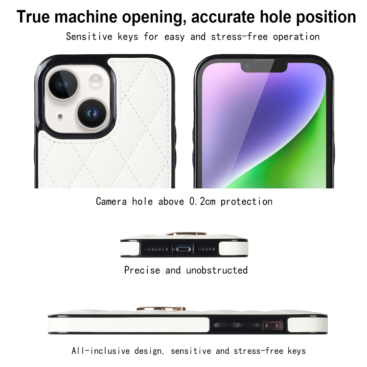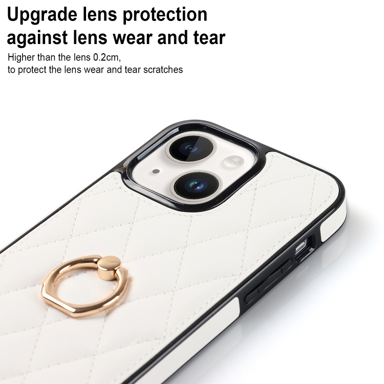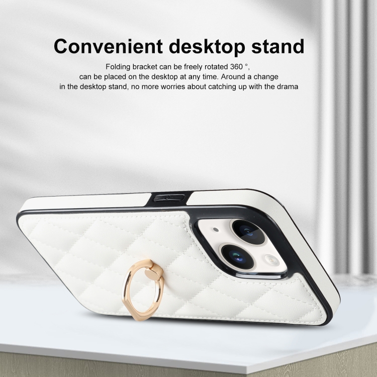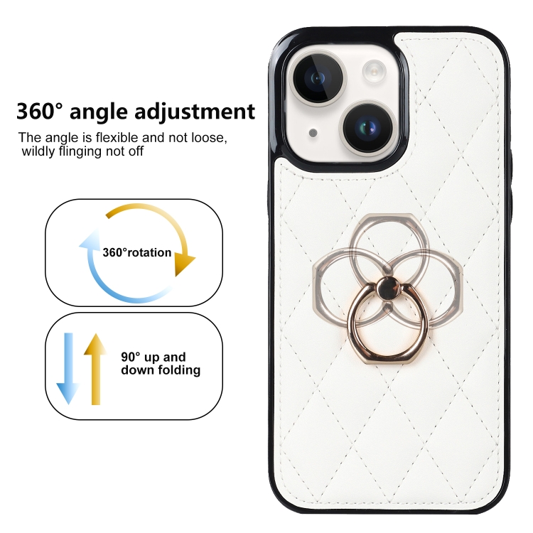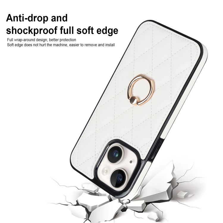 Funda de teléfono Rhombic para iPhone 14 Pu cuero con soporte para anillo (Blanco)