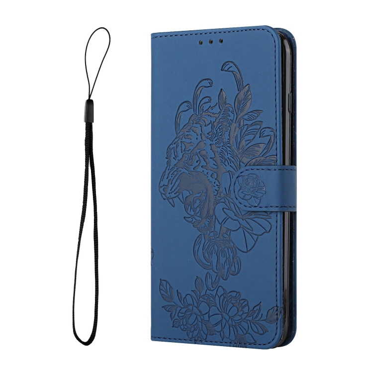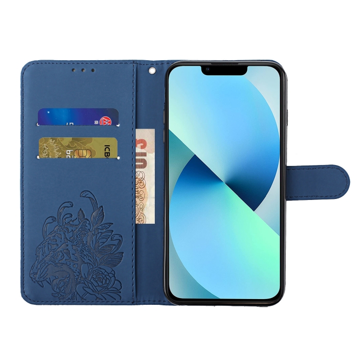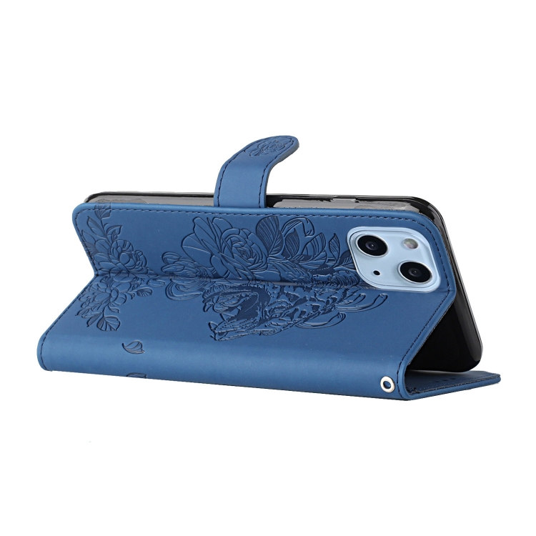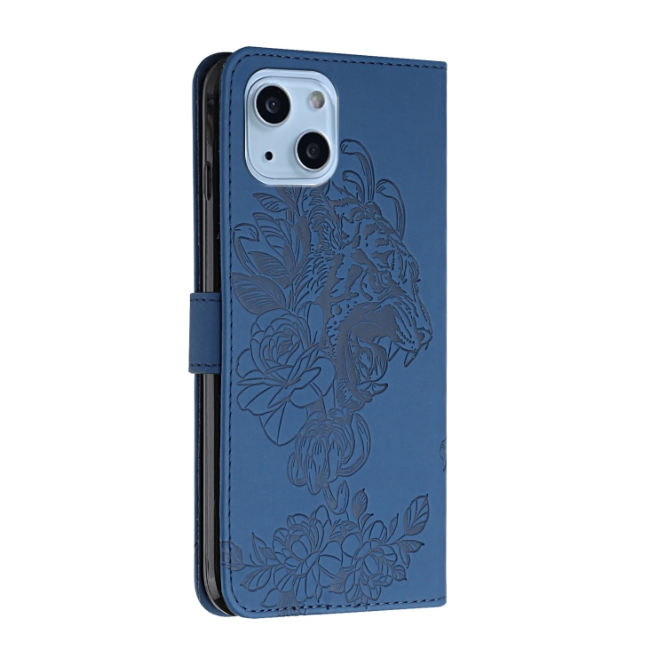Funda de Cuero para Teléfono iPhone 14 Tiger Flower Repujado (Azul Real)