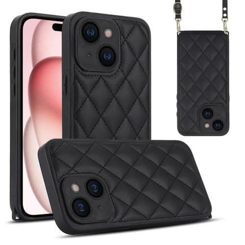 Estuche para Teléfono iPhone 15 con Textura Rómbica y Cordón Doble (Negro)