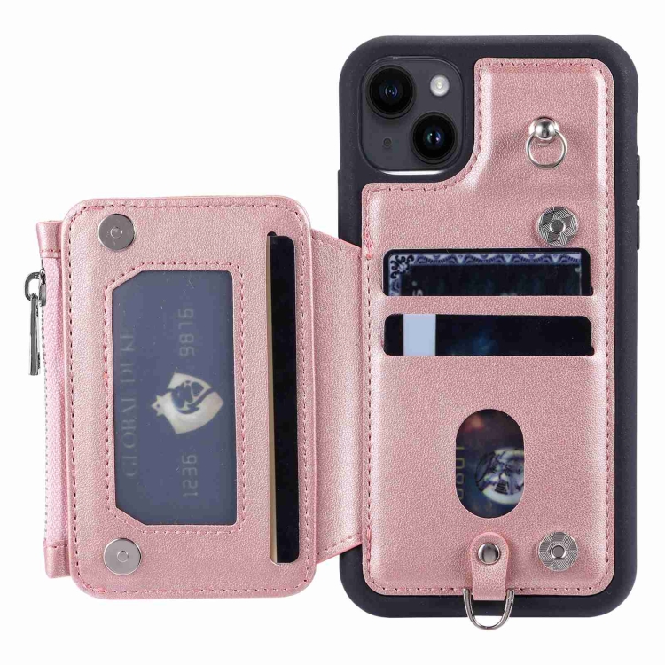 Estuche para Teléfono iPhone 15 con Rfid y Ranuras para Tarjetas con Cremallera (Oro Rosa)