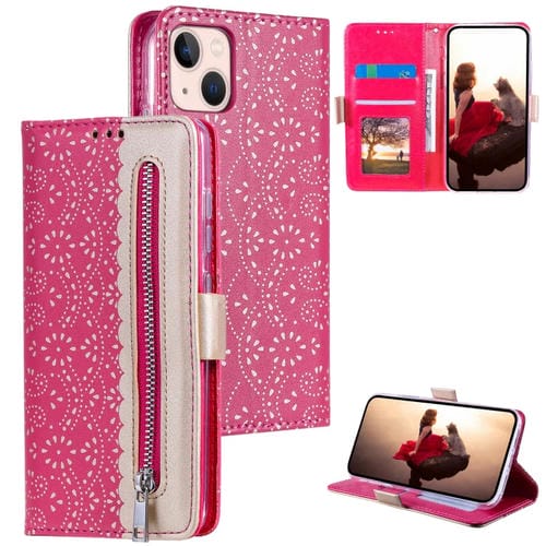 Funda de Cuero para iPhone 15 con Cremallera Doble Botón Patrón Encaje y Cordón (Rojo Rosa)