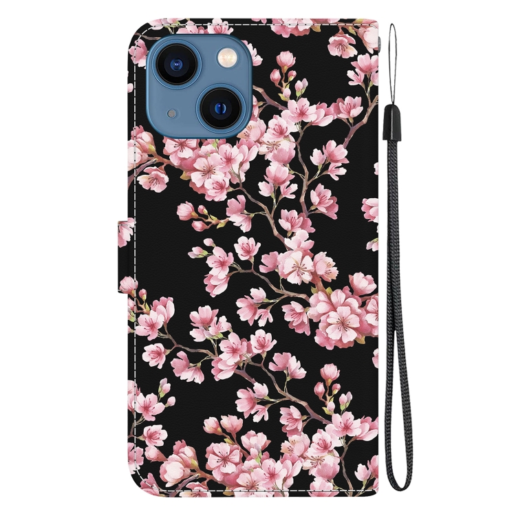 Funda de Cuero para iPhone 15 con Dibujo Coloreado y Textura de Cristal (Flor de Ciruelo)