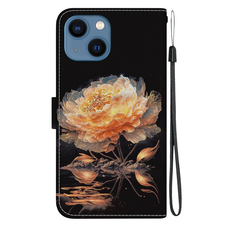 Funda de Cuero para iPhone 15 con Dibujo Coloreado y Textura de Cristal (Peonía Dorada)