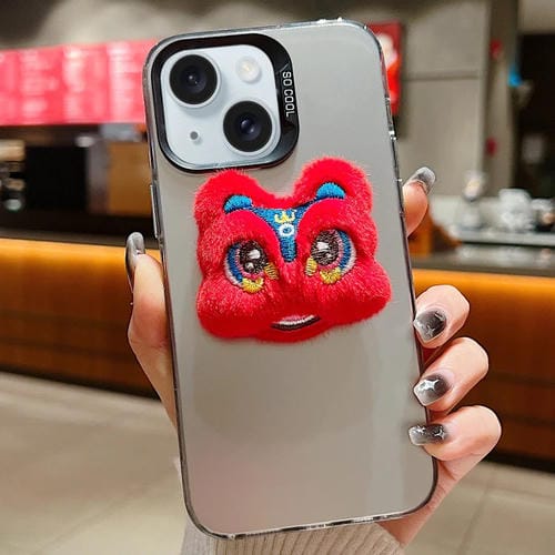 Funda para Teléfono iPhone 15 Muñeco de Peluche Danza del León Año Nuevo (León Rojo con Parte Posterior Gris)