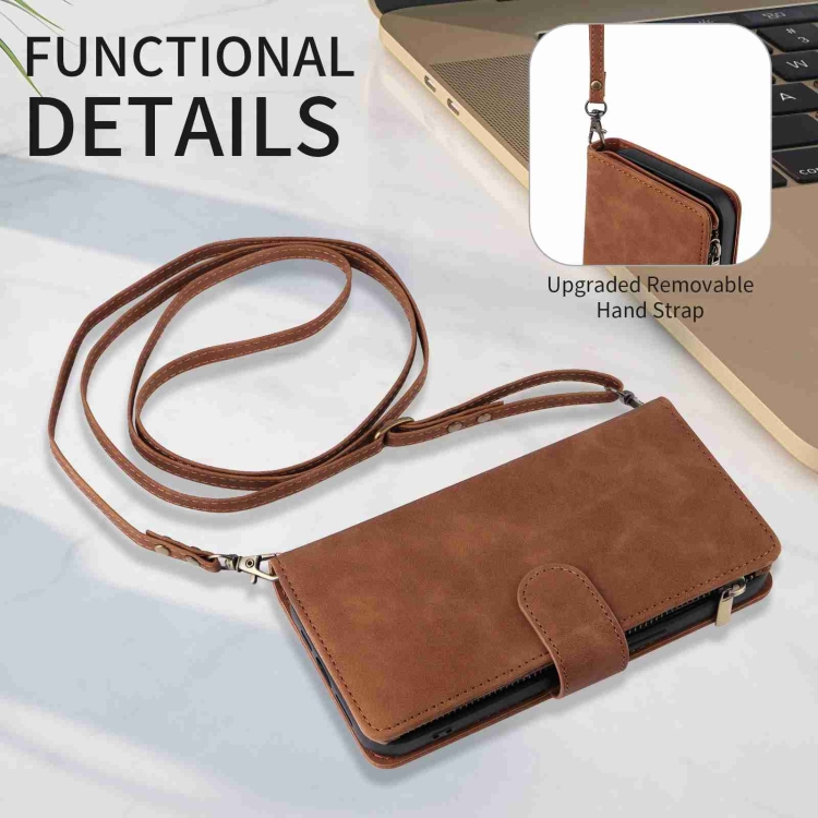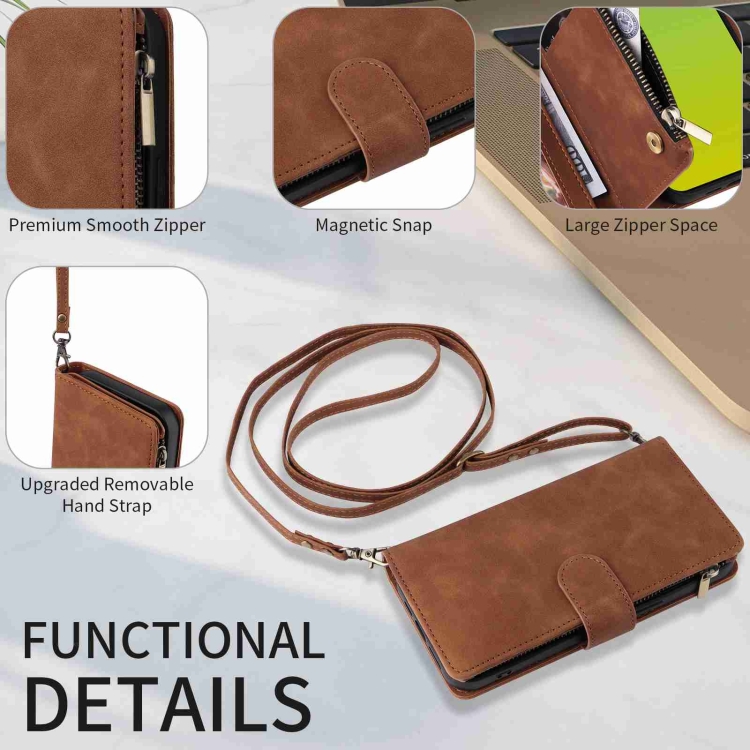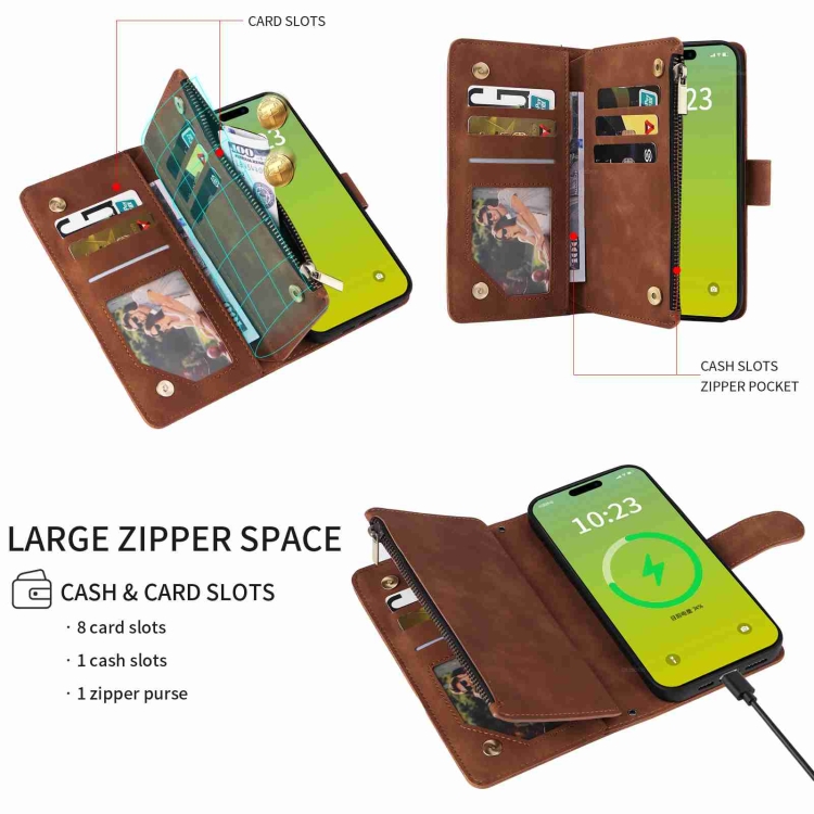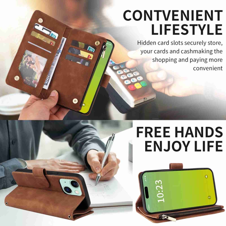 Funda para Teléfono iPhone 15 Cuero con Cremallera y Ranura para Tarjetas Cruzadas (Marrón)