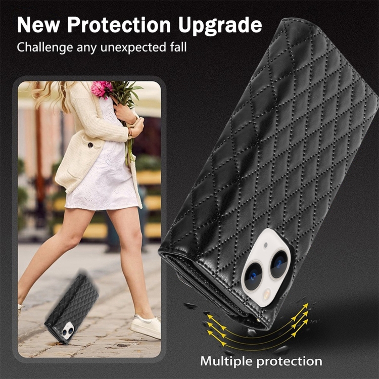 Funda para Teléfono iPhone 15 Cuero Rómbico Billetera MultiTarjeta con Cremallera (Negro)