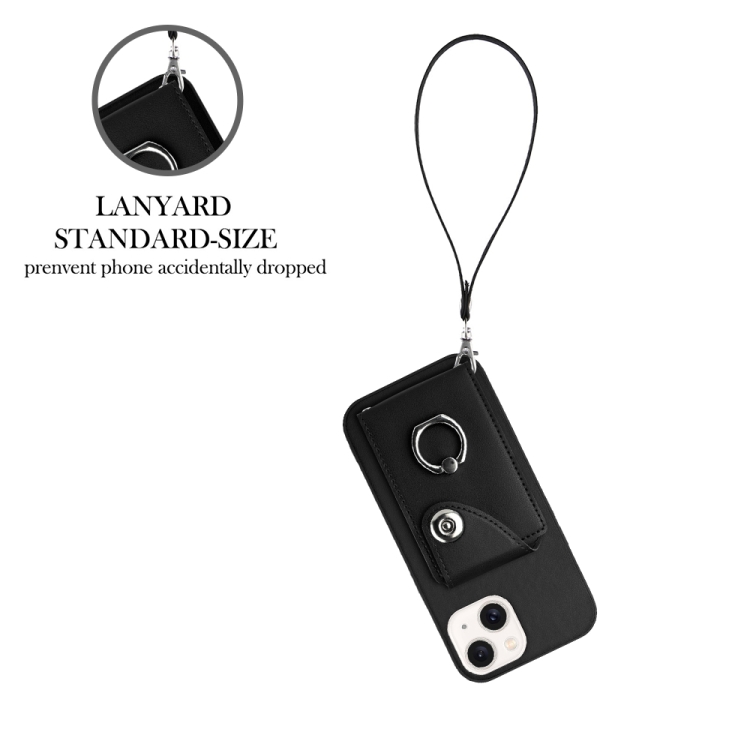 Funda para Teléfono iPhone 15 de PU con Soporte para Anillo y Bolsa para Tarjeta con Cordón (Negro)