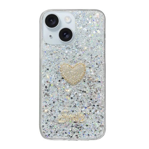 Funda para Teléfono TPU Epoxi iPhone 15 Corazón de Diamante y Lentejuelas Estrelladas (Plateado)