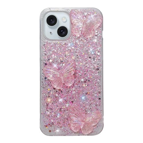 Funda para Teléfono TPU Epoxi iPhone 15 con Mariposas de Cristal y Lentejuelas Estrelladas (Rosa)