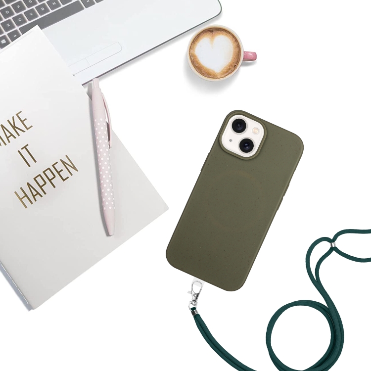 Funda para Teléfono iPhone 15 Material de Paja Magnético Magsafe de Trigo con Cordón (Verde Militar)