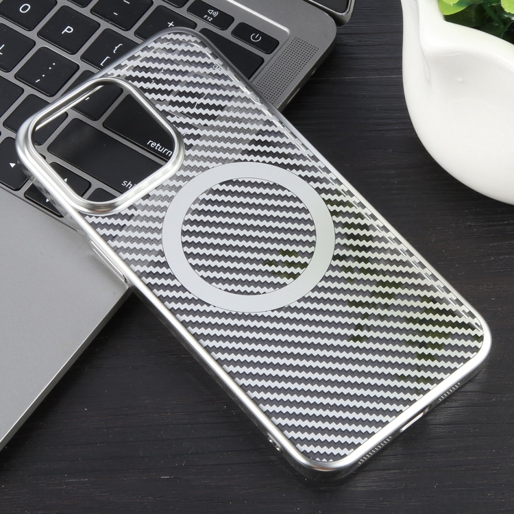 Caja de Teléfono para iPhone 15 Plus PC Magsafe Transparente Fibra de Carbono (Starlight Silver)