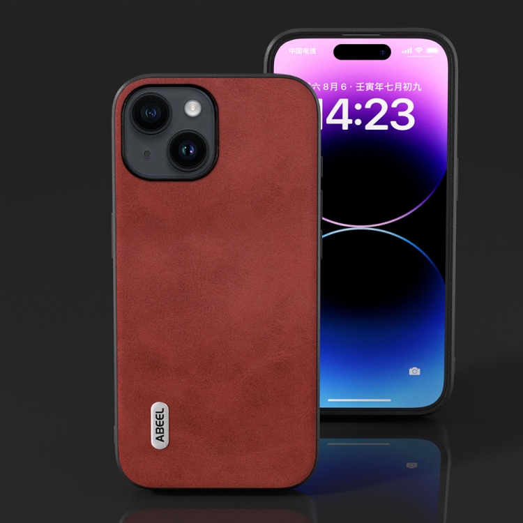 Funda de teléfono Abeel para iPhone 15 Plus Pu textura piel de vaca doble color (Rojo)