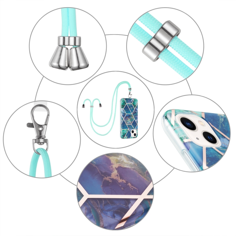 Estuche TPU para iPhone 15 Plus Galvanoplastia Empalme Patrón Mármol a Prueba de Golpes con Cordón (Azul Verde)
