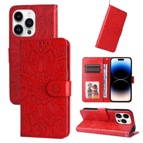 Estuche para Teléfono iPhone 15 Pro Cuero Estampado Girasol En Relieve (Rojo)