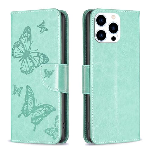 Estuche para Teléfono iPhone 15 Pro Cuero Patrón Mariposas En Relieve (Verde)