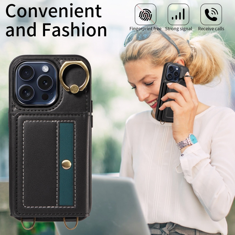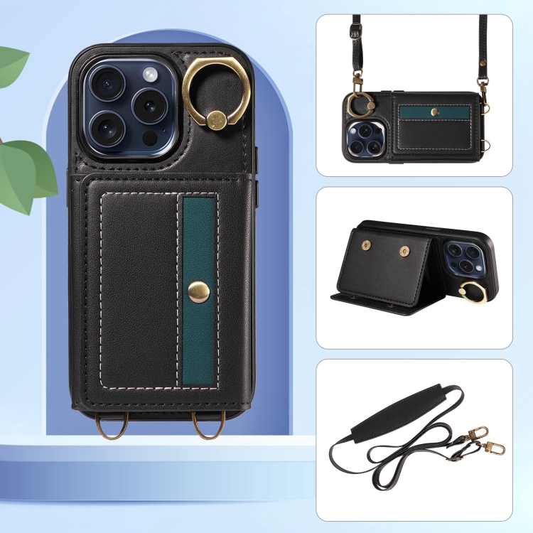 Funda para Teléfono iPhone 15 Pro Cuero Soporte para Anillo Bolso Cruzado para Tarjetas (Negro)