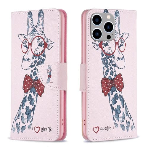 Estuche para Teléfono iPhone 15 Pro Max Cuero con Patrón de Dibujo Coloreado (Jirafa)