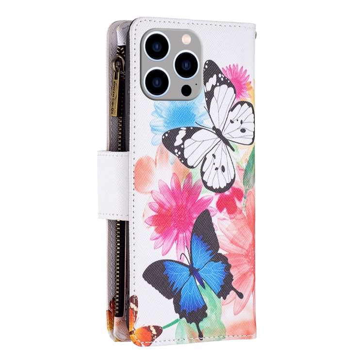 Funda de Cuero para iPhone 15 Pro Max con Cremallera y Patrón de Dibujo Coloreado (Dos Mariposas)