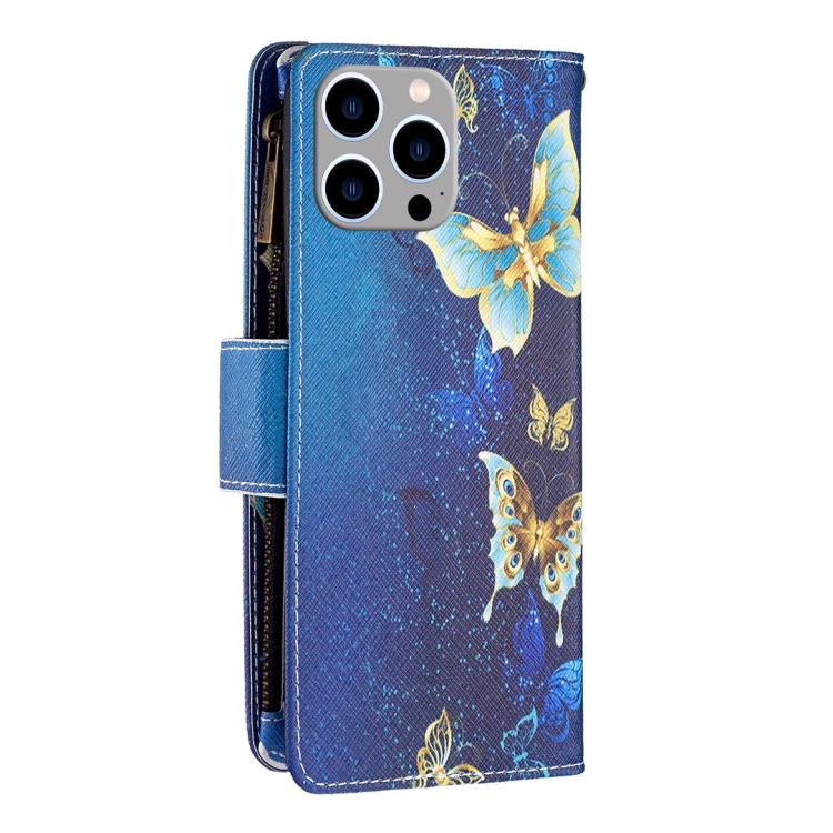 Funda de Cuero para iPhone 15 Pro Max con Cremallera y Patrón de Dibujo Coloreado (Mariposa Dorada)