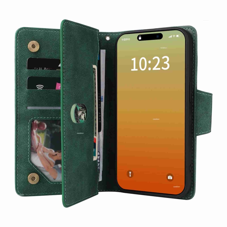 Funda para iPhone 15 Pro de Cuero con Remache Hebilla y 9 Tarjetas con Tres Pliegues (Verde)