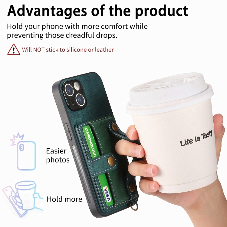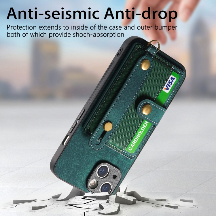 Funda Trasera para iPhone 15 Retro Cross Muñequera Monedero de Cuero (Verde)