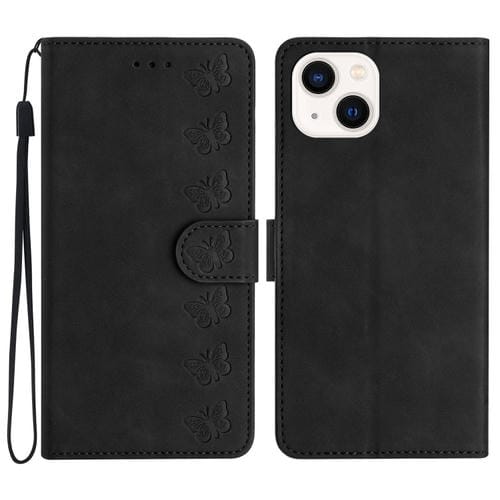 Funda para iPhone 15 Seven Butterflies Caja de Teléfono de Cuero En Relieve (Negro)