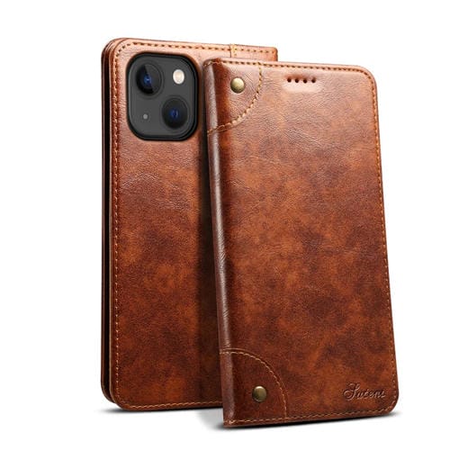 Funda para Teléfono Suteni iPhone 15 Cuero con Billetera Textura Becerro Barroca (Caqui)