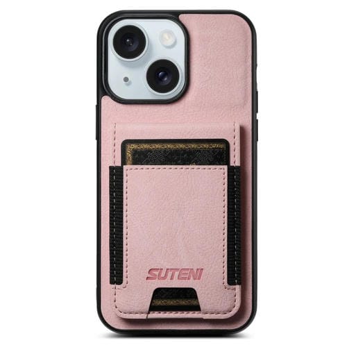 Funda para Teléfono Suteni H03 para iPhone 15 con Soporte para Tarjeta Cuero Litchi (Rosa)