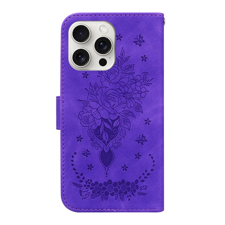 Funda para Teléfono iPhone 16 Pro Cuero con Relieve Mariposa y Rosa (Púrpura)
