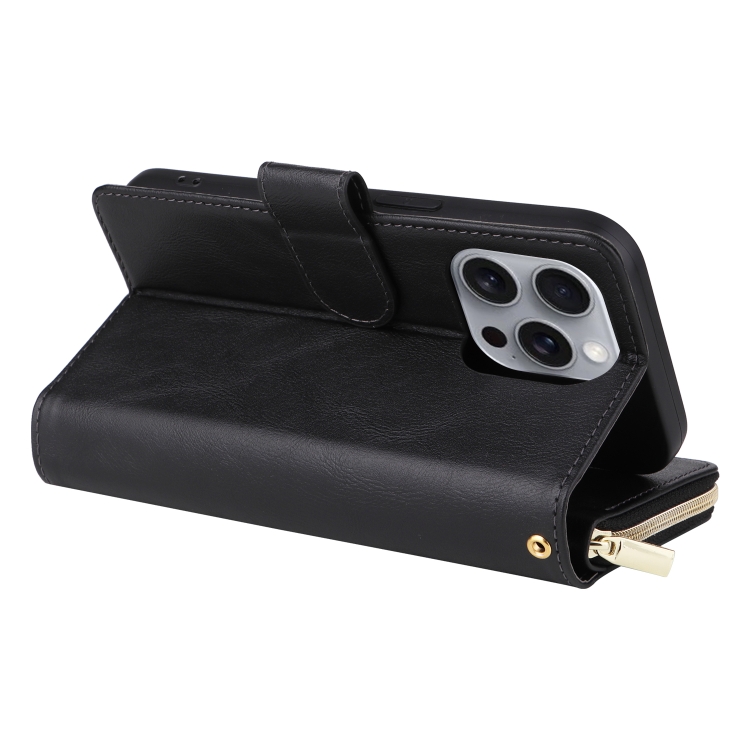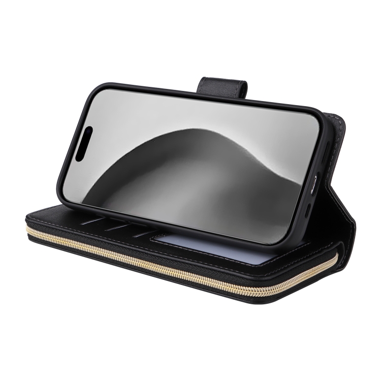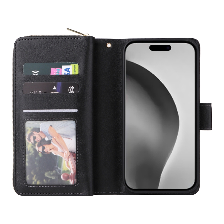 Funda para iPhone 16 Pro Max Bolso Tipo Billetera con 9 Ranuras para Tarjetas y Cremallera (Negro)