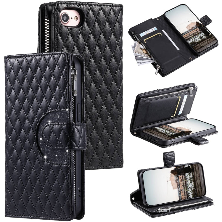 Estuche de Cuero para iPhone 7/8/Se 2022 con Billetera, Cremallera y Celosía con Purpurina (Negro)