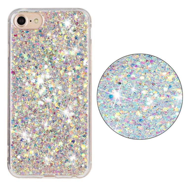 Caja de teléfono TPU para iPhone 8/7 con polvo de brillo y marco Transparente (Blanco)