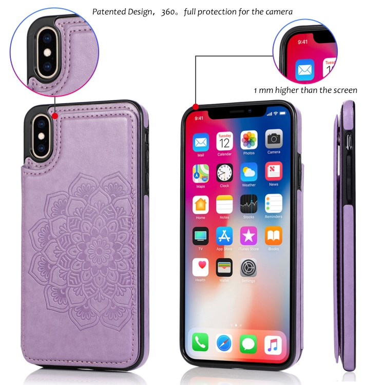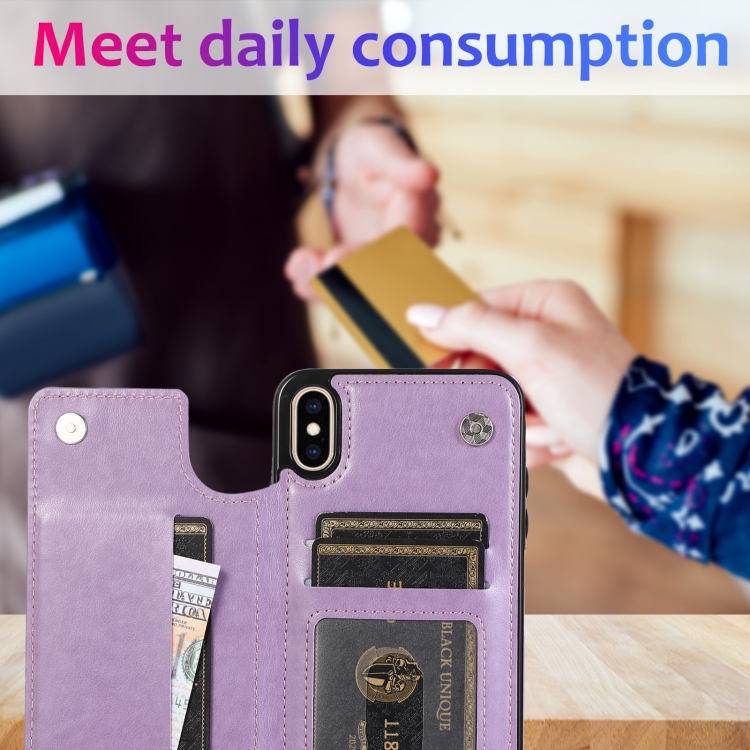 Estuche protector iPhone Xr PU + TPU doble hebilla con ranuras soporte y marco de fotos (Púrpura)