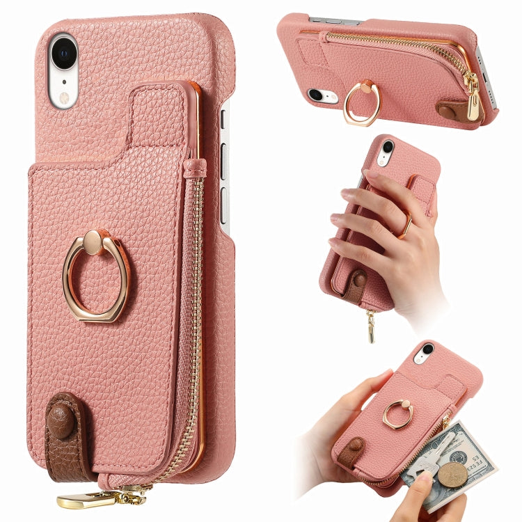 Funda Trasera para iPhone Xr con Billetera, Cremallera y Anillo de Cuero Litchi (Rosa)