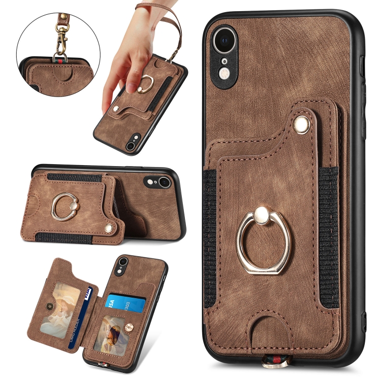 Funda para iPhone Xr Retro Skin-Feel Ring Multi-Card Wallet (Marrón)