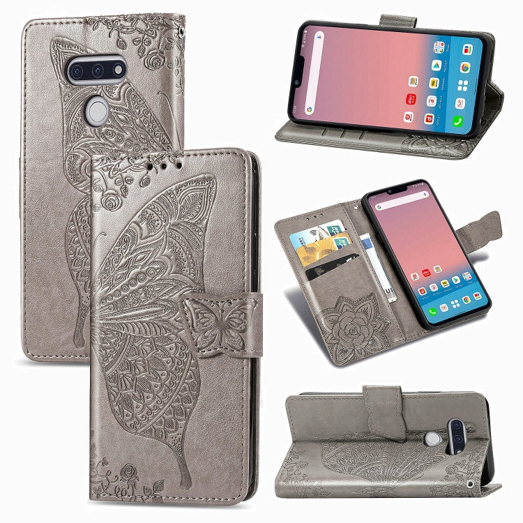 Funda de Cuero para LG Style3 L-41A Butterfly Love Flower con Tapa Horizontal, Soporte, Ranura para Tarjeta y Cordón (Gris)