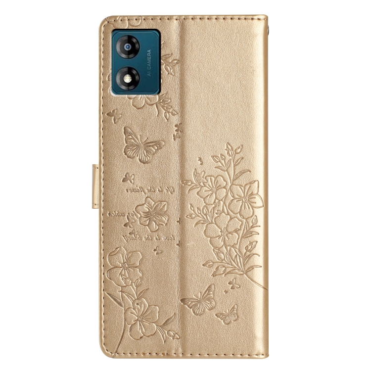 Funda de Cuero para Motorola Moto E13 con Mariposas y Flores (Dorado)