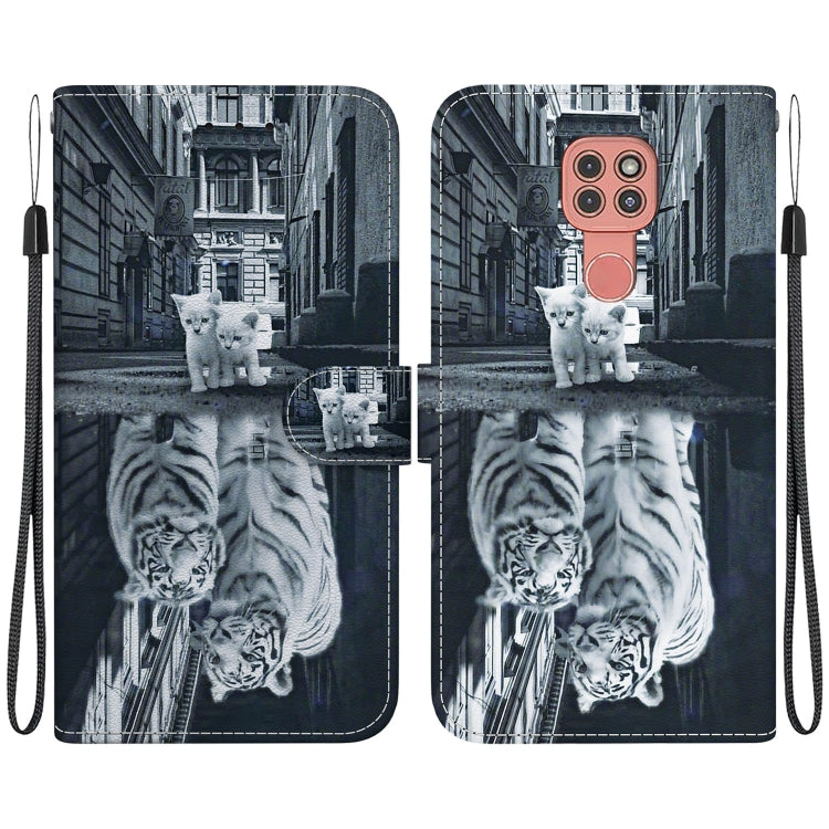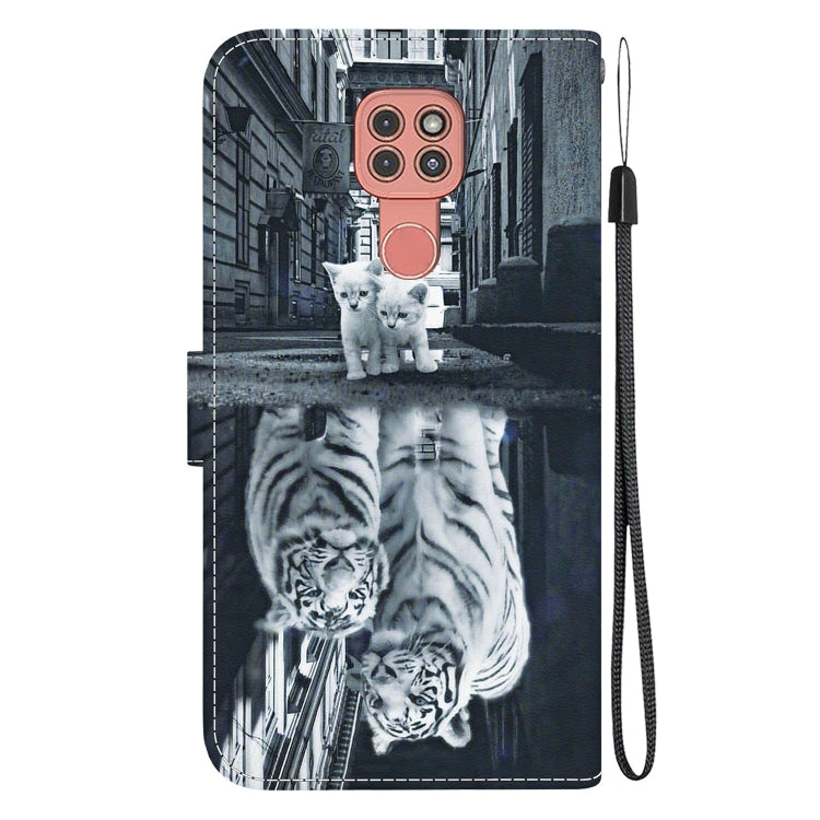 Funda de Cuero para Motorola Moto G9 Play y E7 Plus con Dibujo Coloreado y Textura de Cristal (Reflejo de Tigre Gato)