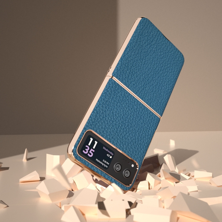Funda para Motorola Razr 40 con Textura Litchi de Cuero Genuino y Galvanoplastia Nano (Azul)